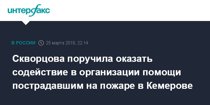 "В связи с пожаром в торговом центре в города Кемерово министр Вероника Скворцова дала поручение специалистам федеральных учреждений оказывать необходимое содействие региональным коллегам в организации медицинской помощи пострадавшим",- сказали в пресс-службе в воскресенье.