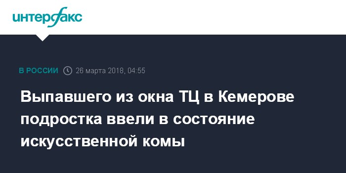 Москва. 26 марта. INTERFAX.RU - Подросток, выпавший из окна горящего торгового центра в Кемерове, находится в реанимации, сообщил "Интерфаксу" информированный источник в медицинских кругах.