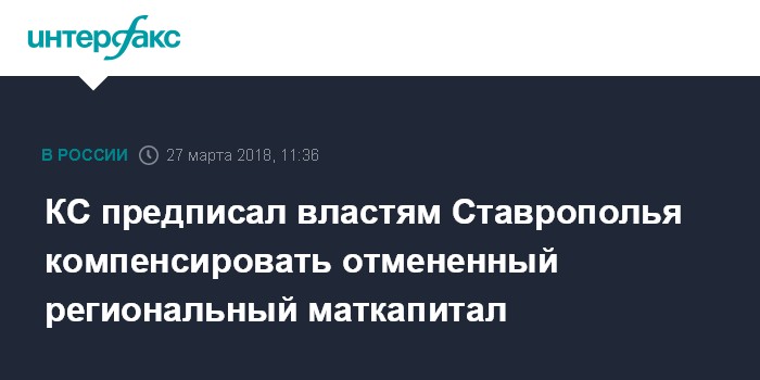 Москва. 27 марта. INTERFAX.RU - Конституционный суд РФ на заседании во вторник предписал властям Ставропольского края компенсировать региональный материнский капитал, отмененный в 2016 году в связи с отсутствием средств в бюджете.