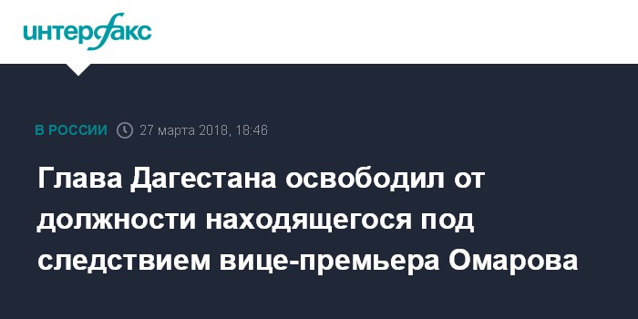 Москва. 27 марта. INTERFAX.RU - Врио главы Дагестана Владимир Васильев освободил от занимаемой должности заместителя председателя правительства Билала Омарова.