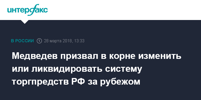 Москва. 28 марта. INTERFAX.RU - Многолетние попытки реформировать систему торговых представительств РФ за рубежом, сделав ее инструментом защиты интересов бизнеса и развития экспорта, до сих пор не дали результата, ее нужно в корне менять или даже ликвидировать в нынешнем виде, считает премьер-министр Дмитрий Медведев.