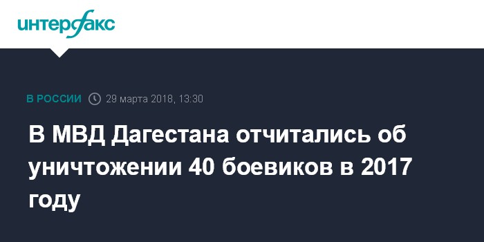 Москва. 29 марта. INTERFAX.RU - Десятки участников незаконных вооруженных формирований были уничтожены в Дагестане в минувшем году, сообщил министр внутренних дел республики Абдурашид Магомедов.