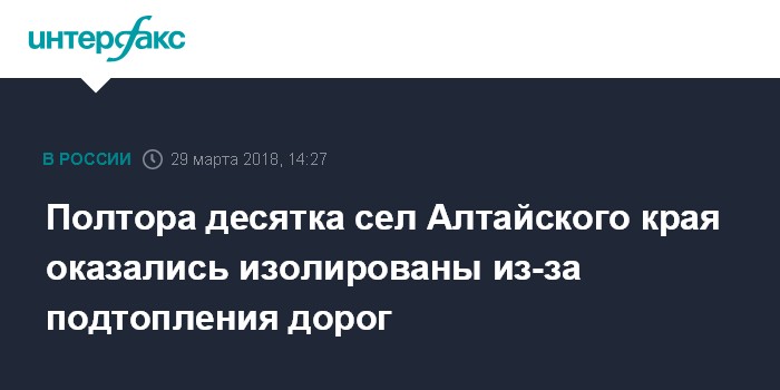 Москва. 29 марта. INTERFAX.RU - В шести районах Алтайского края из-за поврежденных паводком дорог и мостов нарушено транспортное сообщение, сообщает пресс-центр правительства региона в четверг.