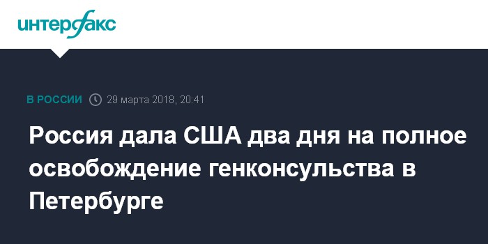 Москва. 29 марта. INTERFAX.RU - Российские власти дали два дня на полное освобождение здания генконсульства США в Санкт-Петербурге.