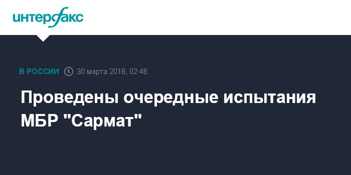 Москва. 30 марта. INTERFAX.RU - Очередные испытания новой жидкостной межконтинентальной баллистической ракеты (МБР) тяжелого класса "Сармат" проведены на космодроме Плесецк, сообщает Минобороны России.