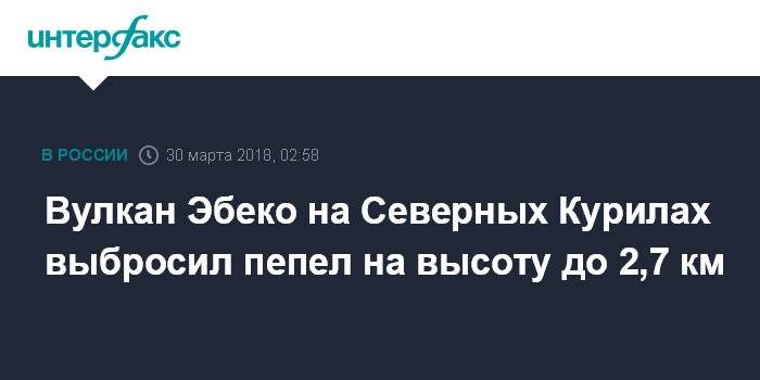 Москва. 30 марта. INTERFAX.RU - Расположенный на острове Парамушир (Северные Курилы, Сахалинская область) вулкан Эбеко в пятницу утром выбросил столб пепла на высоту до 2,7 км над уровнем моря, сообщает Камчатская группа реагирования на вулканические извержения (KVERT) Института вулканологии и сейсмологии Дальневосточного отделения РАН.