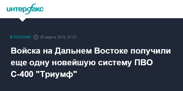 "Таким образом, в Восточном военном округе уже в нескольких зенитных ракетных воинских частях будет осуществляться боевое дежурство на ЗРС С-400", - сказано в пресс-релизе, который поступил в "Интерфакс-АВН".