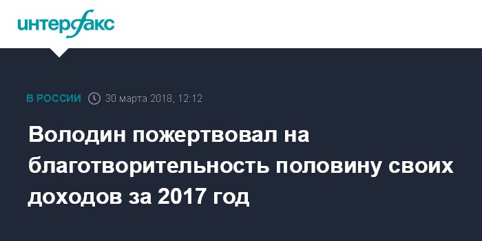 "Вячеслав Володин по итогам 2017 года, как и прежде, половину своих доходов - 25 млн 500 тысяч рублей направил на благотворительность", - сказал собеседник агентства.