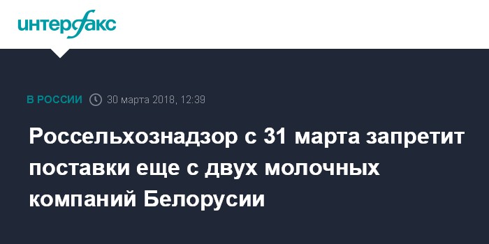 Россельхознадзор с 31 марта запретит поставки еще с двух молочных компаний Белорусии