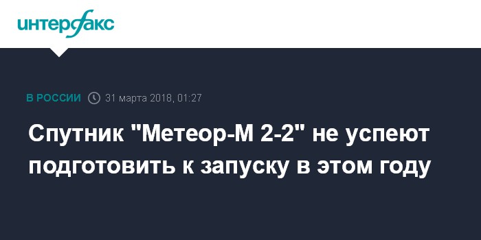"Производство космического аппарата "Метеор-М 2-2" затягивается. Не исключено, что спутник не успеют подготовить и запуск придется перенести. Таким образом, в 2018 году с Восточного может стартовать лишь ракета-носитель "Союз 2.1а" с аппаратами дистанционного зондирования Земли (ДЗЗ) "Канопус-В" N5 и N6. Аппараты в высокой степени готовности", - сказал собеседник агентства.