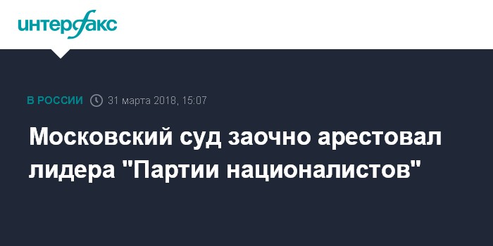 Москва. 31 марта. INTERFAX.RU - Мещанский суд Москвы заочно арестовал одного из лидеров незарегистрированной "Партии националистов" Ивана Белецкого по обвинению в призывах к экстремизму.