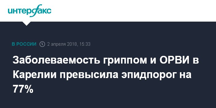 Москва. 2 апреля. INTERFAX.RU - Заболеваемость острыми респираторными вирусными инфекциями (ОРВИ) и гриппом в Карелии превысила уровень эпидемического порога на 77%, зарегистрировано свыше девяти тысяч случаев, сообщает пресс-служба местного управления Роспотребнадзора.