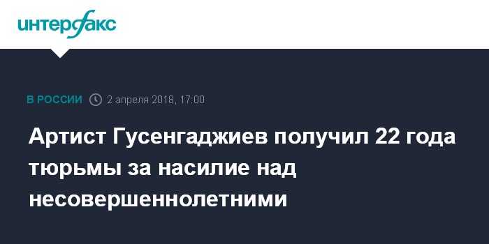 Москва. 2 апреля. INTERFAX.RU - Суд в Москве приговорил 53-летнего актера цирка, кино и телевидения Мухтара Гусенгаджиева к 22 годам заключения за сексуальное насилие над несовершеннолетними, сообщила представитель столичного главка Следственного комитета (СК) Юлия Иванова.