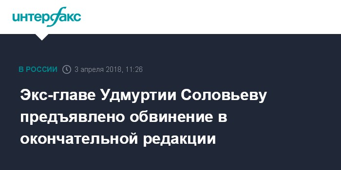 "В окончательной редакции предъявлено обвинение бывшему главе Удмуртской республики Александру Соловьеву. Ему инкриминируется два эпизода получения взятки должностным лицом, занимающим государственную должность, в особо крупном размере", - заявилаПетренко "Интерфаксу".