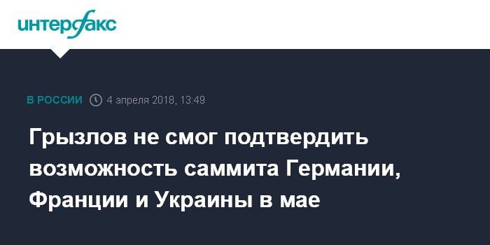 Москва. 4 апреля. INTERFAX.RU - Полпред РФ в трехсторонней контактной группе по урегулированию ситуации на востоке Украины Борис Грызлов сообщил, что российская сторона не располагает подтверждением возможности проведения в мае встречи в немецком городе Аахен лидеров Германии, Франции и Украины.