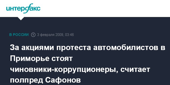 "Данный вид бизнеса остается одним из самых криминализированных на Дальнем Востоке. Реализуются схемы контрабандных поставок иномарок, а это значит, что бюджет недополучает денег, а если бюджет недополучает, значит - мы не можем принимать решение о повышении пенсий, пособий и так далее. За этими митингами и манифестациями, по данным правоохранительных органов, в том числе стоит криминалитет и чиновники-коррупционеры", - сказал О.Сафонов в интервью агентству "Интерфакс-Дальний Восток" во вторник.