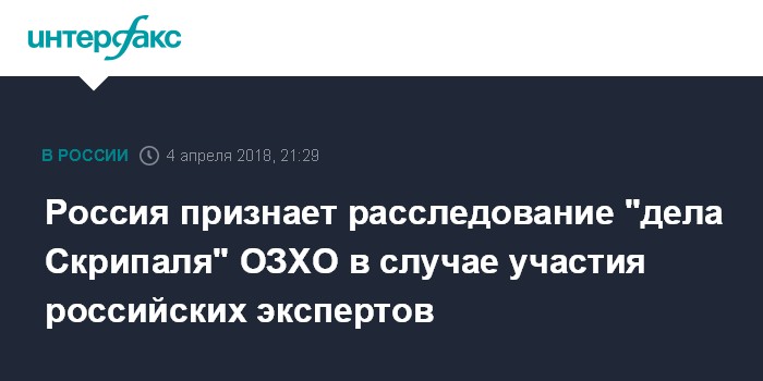 Москва. 4 апреля. INTERFAX.RU - Россия признает результаты расследования с участием специалистов Организации по запрещению химического оружия (ОЗХО) по "делу Скрипаля", если оно будет опираться на факты и в нем примут участие российские специалисты.