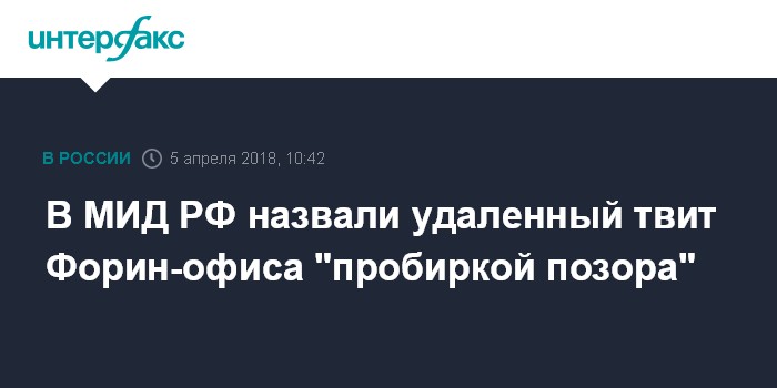 В МИД РФ назвали удаленный твит Форин-офиса "пробиркой позора"