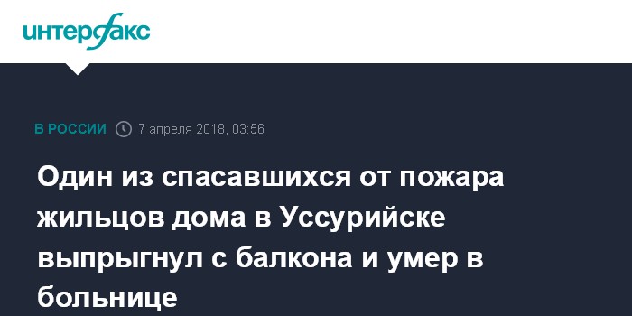 "Один мужчина выпрыгнул с балкона, он погиб в больнице", - сообщила "Интерфаксу" старший помощник руководителя управления СКР по Приморью Аврора Римская.