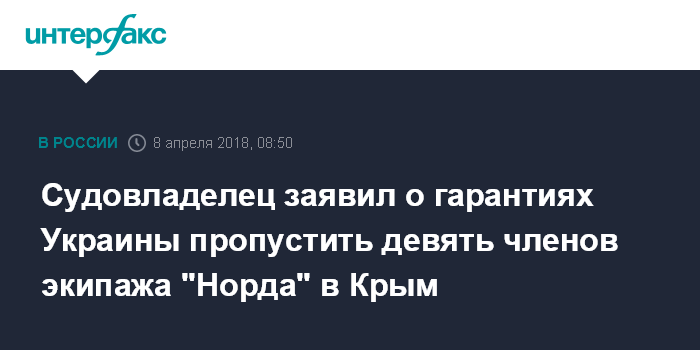 Москва. 8 апреля. INTERFAX.RU - Украинская сторона обещает пропустить девятерых членов экипажа крымского рыболовецкого судна "Норд", привлеченных ранее к административной ответственности, с территории Украины в Крым через пункт пропуска "Чонгар", заявил "Интерфаксу" представитель судовладельца.