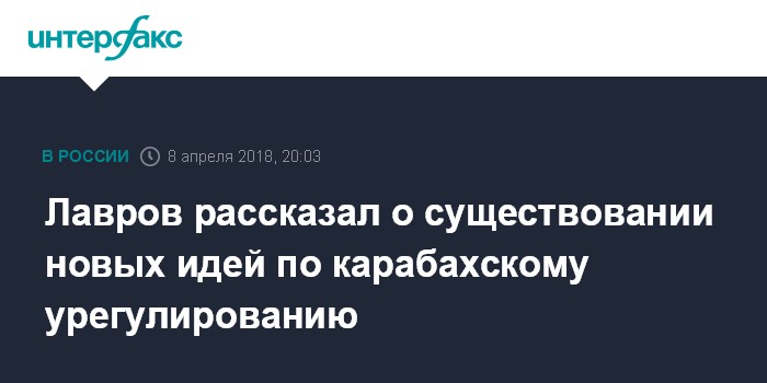 Москва. 8 апреля. INTERFAX.RU - У стран-сопредседателей Минской группы ОБСЕ по карабахскому урегулированию появились новые идеи для решения кризиса, которые в настоящее время продвигаются в контактах со сторонами конфликта, заявил глава МИД РФ Сергей Лавров в интервью армянским телеканалам.