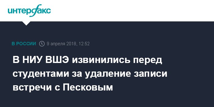 Москва. 9 апреля. INTERFAX.RU - Преподаватели департамента медиа факультета коммуникаций, медиа и дизайна НИУ ВШЭ принесли извинения студентам в связи с удалением из публичного доступа записи учебной программы "В точку!" с участием пресс-секретаря президента РФ Дмитрия Пескова.