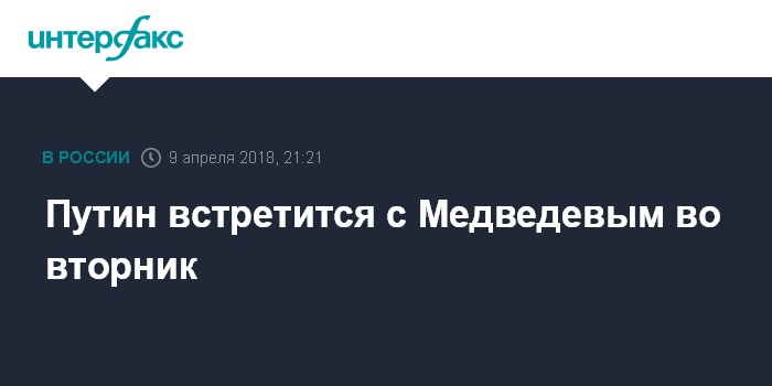 Москва. 9 апреля. INTERFAX.RU - Президент РФ Владимир Путин планирует во вторник провести встречу с премьер-министром Дмитрием Медведевым, подтвердил "Интерфаксу" пресс-секретарь главы государства Дмитрий Песков.