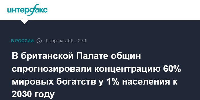 Москва. 10 апреля. INTERFAX.RU - Порядка двух третей мирового благосостояния к 2030 году будет контролироваться 1% населения, свидетельствуют прогноз библиотеки Палаты общин Великобритании.