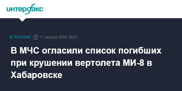 Москва. 11 апреля. INTERFAX.RU - Установлены личности погибших при крушении вертолета Ми-8 в Хабаровске, сообщил заместитель начальника ГУ МЧС РФ по краю Иван Колонтай.