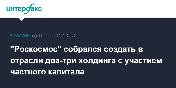 Москва. 11 апреля. INTERFAX.RU - Госкорпорация "Роскосмос" планирует создать два-три холдинга с участием частного капитала для повышения конкурентоспособности отечественного ракетостроения, заявил генеральный директор "Роскосмоса" Игорь Комаров.
