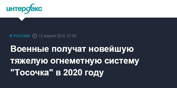 Москва. 12 апреля. INTERFAX.RU - Новую тяжелую огнеметную систему "Тосочка" планируется передать в опытно-войсковую эксплуатацию уже в 2020 году, сообщил "Интерфаксу" заместитель гендиректора "Техмаша" (входит в Ростех) Александр Кочкин.