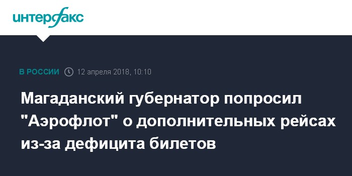 Москва. 12 апреля. INTERFAX.RU - Губернатор Магаданской области Владимир Печеный попросил у авиакомпании "Аэрофлот" ввести дополнительные рейсы из-за дефицита билетов, сообщает в четверг пресс-служба правительства региона.
