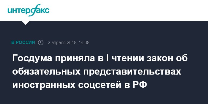 Москва. 12 апреля. INTERFAX.RU - Госдума в четверг приняла в первом чтении законопроект, обязывающий владельца публичной сети создавать на территории РФ свое представительство, вести реестр обращений пользователей и удалять по их заявлениям недостоверную информацию.