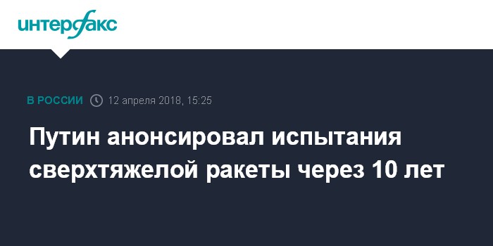 Москва. 12 апреля. INTERFAX.RU - Президент РФ Владимир Путин сообщил о планах начать испытания российской сверхтяжелой ракеты в 2028 году.