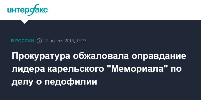Прокуратура обжаловала оправдание лидера карельского "Мемориала" по делу о педофилии
