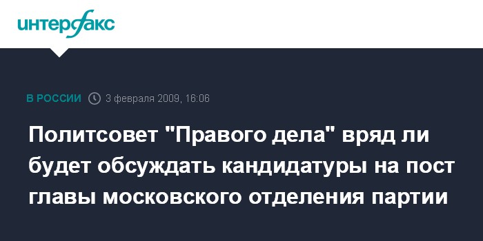 Москва. 3 февраля. INTERFAX.RU - На утро среды запланировано заседание политсовета "Правого дела", но вопрос о кандидатах на пост руководителя московского отделения партии обсуждаться на нем, вероятно, не будет.
