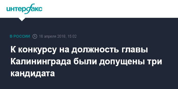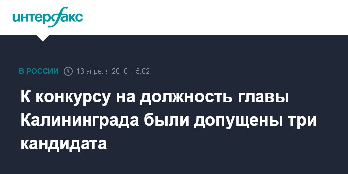 Москва. 16 апреля. INTERFAX.RU - В конкурсе на должность главы Калининграда примут участие три претендента, сообщили "Интерфаксу" в городском Совете депутатов в понедельник.