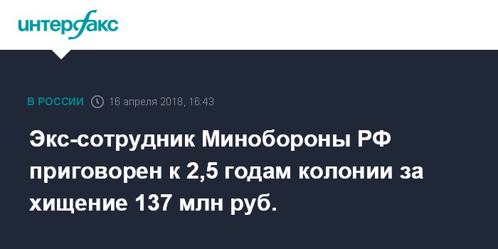 Экс-сотрудник Минобороны РФ приговорен к 2,5 годам колонии за хищение 137 млн руб.