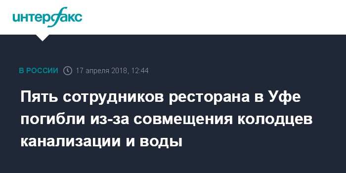 Москва. 17 апреля. INTERFAX.RU - Совмещение колодцев воды и канализации могло привести к гибели пяти человек на территории ресторана в Уфе, заявил мэр города Ирек Ялалов на совещании во вторник.