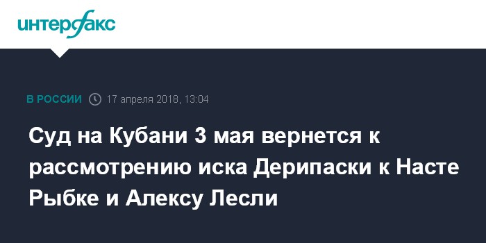 Суд на Кубани 3 мая вернется к рассмотрению иска Дерипаски к Насте Рыбке и Алексу Лесли