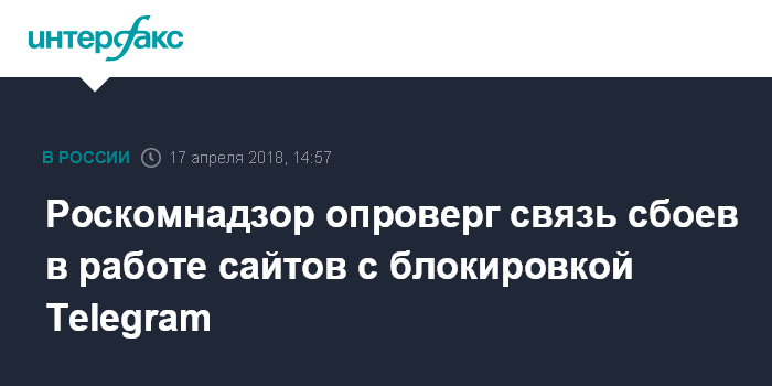 "В связи с исполнением Роскомнадзором судебного решения об ограничении доступа к ресурсам, обеспечивающим функционирование месснждера "Телеграм", в интернете публикуется недостоверная информация о якобы имевших место блокировках добросовестных интернет-ресурсов", - говорится в сообщении ведомства, поступившем в "Интерфакс" во вторник.
