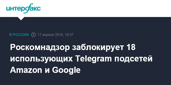 Москва. 17 апреля. INTERFAX.RU - Глава Роскомнадзора Александр Жаров сообщил, что в настоящий момент ведомство блокирует 18 подсетей на ресурсах Amazon и Google, которые использует мессенджер Telegram.