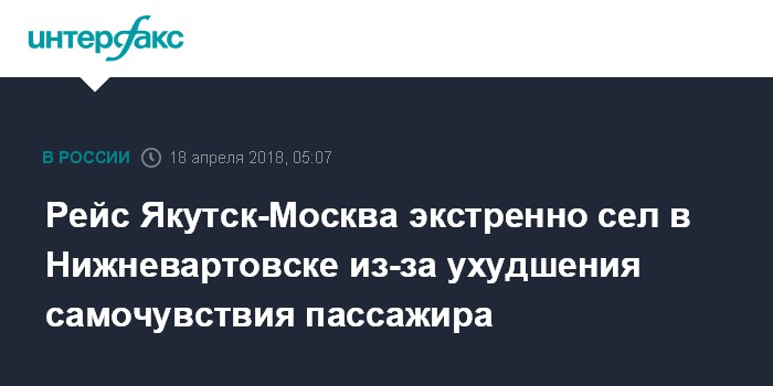 Москва. 18 апреля. INTERFAX.RU - Самолет Boeing 737 АК "Якутия", выполнявший рейс маршруту Якутск-Москва, совершил вынужденную посадку в аэропорту Нижневартовска из-за резкого ухудшения самочувствия пассажира, сообщает во вторник пресс-служба авиакомпании.