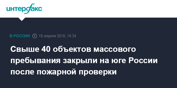 Москва. 19 апреля. INTERFAX.RU - После проверок пожарной безопасности на юге России закрыли более 40 объектов массового пребывания людей, сообщил начальник Южного регионального центра МЧС Игорь Одер в четверг.