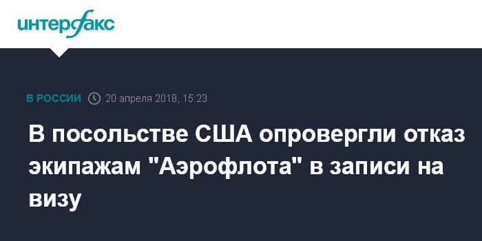 Москва. 20 апреля. INTERFAX.RU - Посольство США в РФ опровергло сообщения о том, что члены экипажей "Аэрофлота" не могут записаться на собеседования на визу США.