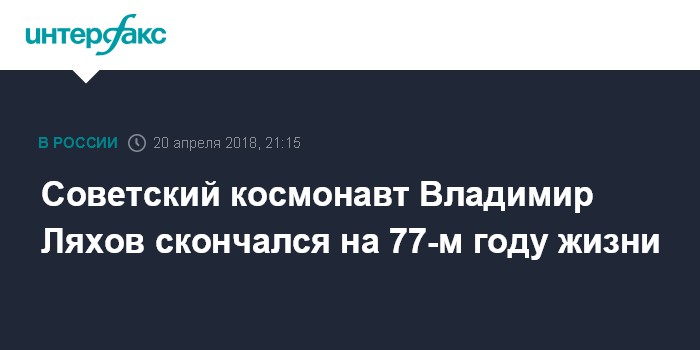 "19 апреля 2018 года на 77-м году скоропостижно ушел из жизни дважды Герой Советского Союза, летчик-космонавт СССР, полковник Владимир Афанасьевич Ляхов", - говорится в сообщении на сайте ЦПК.
