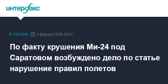 "Военно-следственным отделом СКП по Саратовскому гарнизону по факту крушения 3 февраля 2009 года вертолета Ми-24 возбуждено уголовное дело по признакам преступления, предусмотренного ст.351 УК РФ (нарушение правил полетов или подготовки к ним)", - сказал В.Маркин в среду.