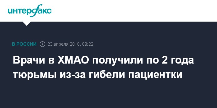 Москва. 23 апреля. INTERFAX.RU - Суд в Ханты-Мансийском автономном округе приговорил каждого из двух хирургов Нефтеюганской окружной клинической больницы имени Яцкив к двум годам ограничения свободы по уголовному делу о гибели пациентки, сообщается на сайте регионального СУ СКР.