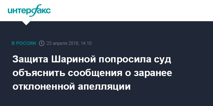 20 апреля Мосгорсуд рассматривал апелляционную жалобу защиты на приговор Наталье Шариной, которую 5 июня 2017 года признал виновной в возбуждении ненависти или вражды и растрате Мещанский районный суд Москвы. После выступления защитников в прениях суд объявил перерыв, следующее заседание было назначено на 24 апреля. Однако после окончания судебного заседания несколько изданий со ссылкой на пресс-службу Московского городского суда опубликовали новость о том, что апелляционная жалоба защиты была оставлена без удовлетворения.