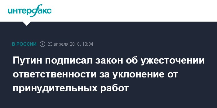Москва. 23 апреля. INTERFAX.RU - Президент РФ Владимир Путин подписал закон, ужесточающий наказание за уклонение от принудительных работ. Соответствующий документ опубликован на официальном сайте правовой информации.